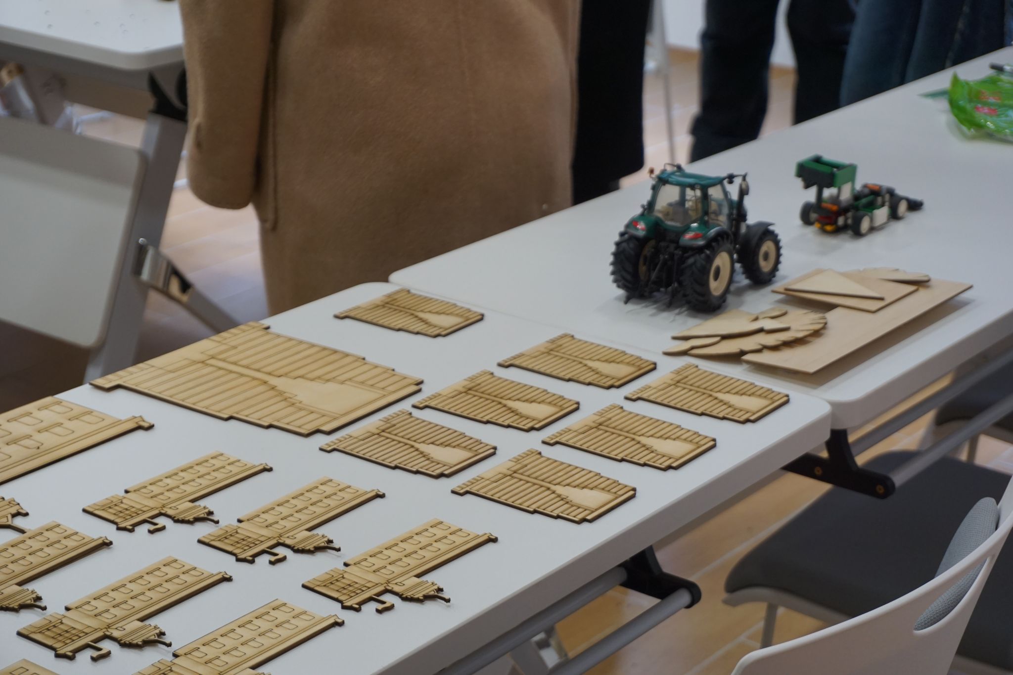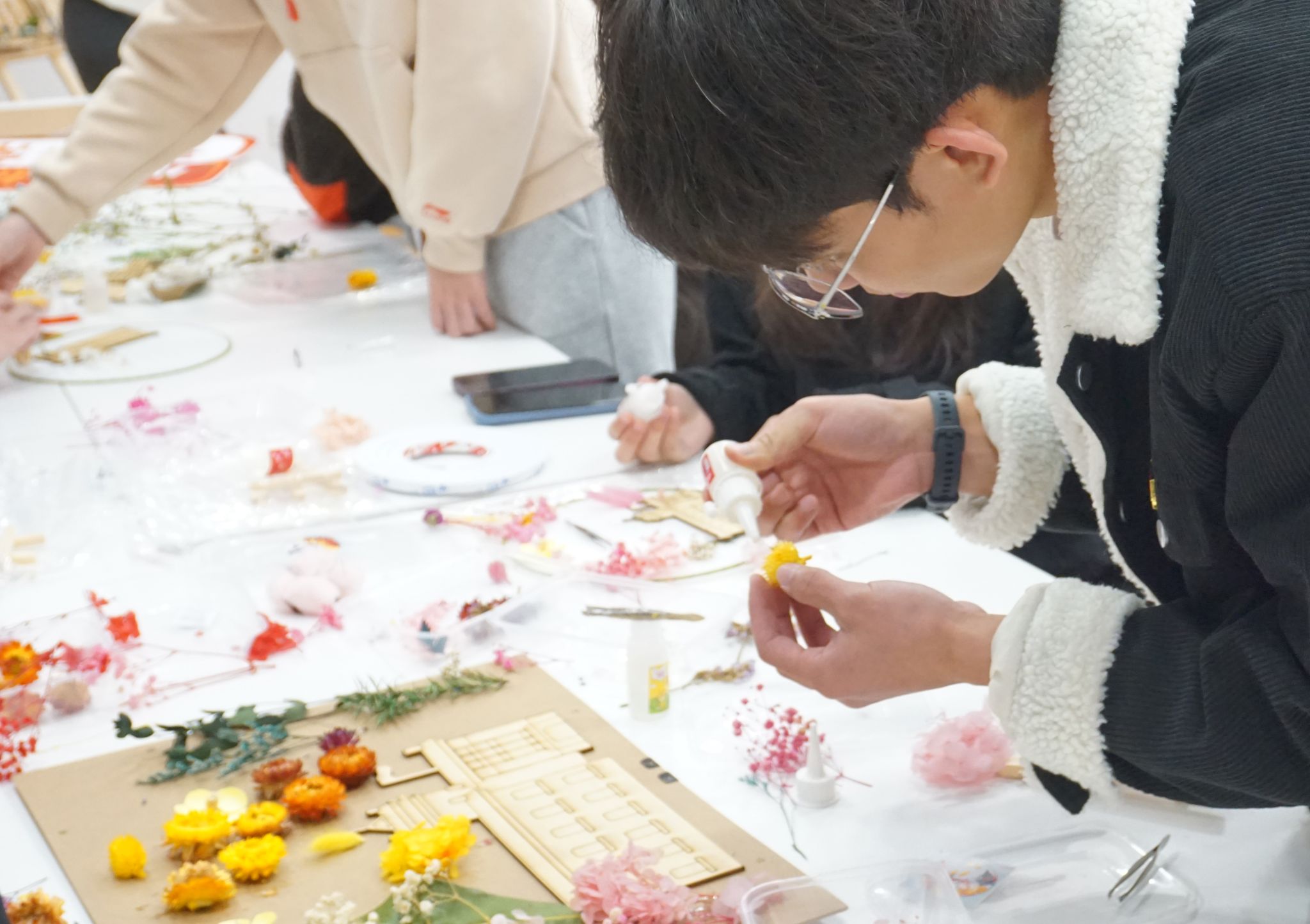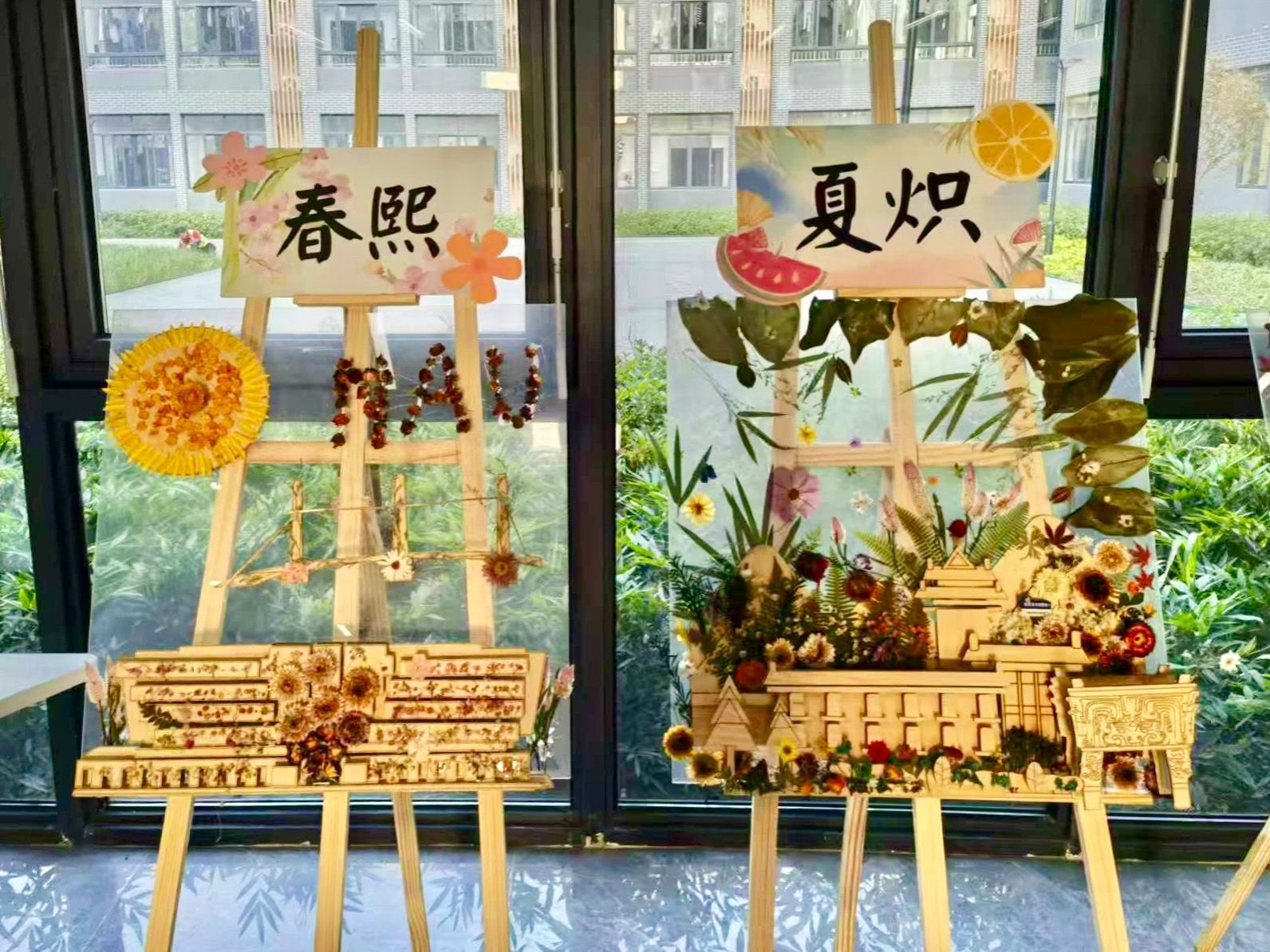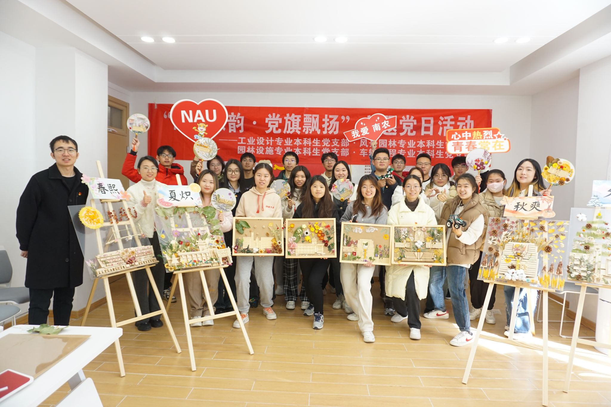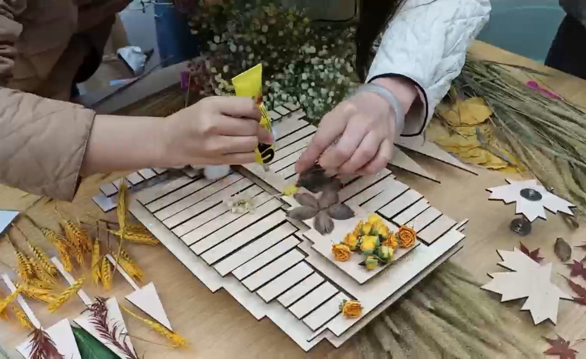 工业设计专业本科生党支部与车辆工程本科生党支部利用工科专业优势,运用绘图、建模等软件,利用电钻、螺钉等工具,从创意构思到底稿设计,从模型切割到立体拼装,通过精准建模、精细切割、精巧组装完成“工艺”设计。风景园林专业本科生党支部和园林设施专业本科生党支部以胶水为笔,用植物做媒,捡枝干画线,挥花瓣成面,将对南农美景的记忆寄托于植物的色彩和搭配上,让四季缤纷之韵跃然呈现在楼宇模型之间,“花艺”之美与“工艺”之精在此刻交融相汇。