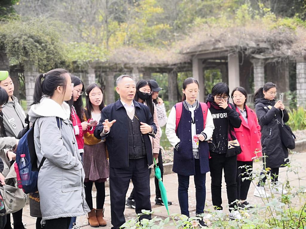 风景园林181班同学在胡长龙的带领下,从植物园的大草坪出发,走到玫瑰园和莲池。胡长龙列举了此处景点的巴洛克式建筑风格特点,并将其与中国古典园林特点进行比较,进行了耐心细致地讲解,让同学们切身感受到所学专业的博大精深。随后到了红枫岭,胡长龙向同学们阐释了“特殊景观”的价值意义,他提到,红枫岭是明显的秋季景观区,同学们将来设计秋景可以从中提取灵感。接着,同学们参观了药用植物园,感受到了药用植物在园林设计中发挥的奇特功效。最后,大家合影留念,十分不舍地离开了植物园。