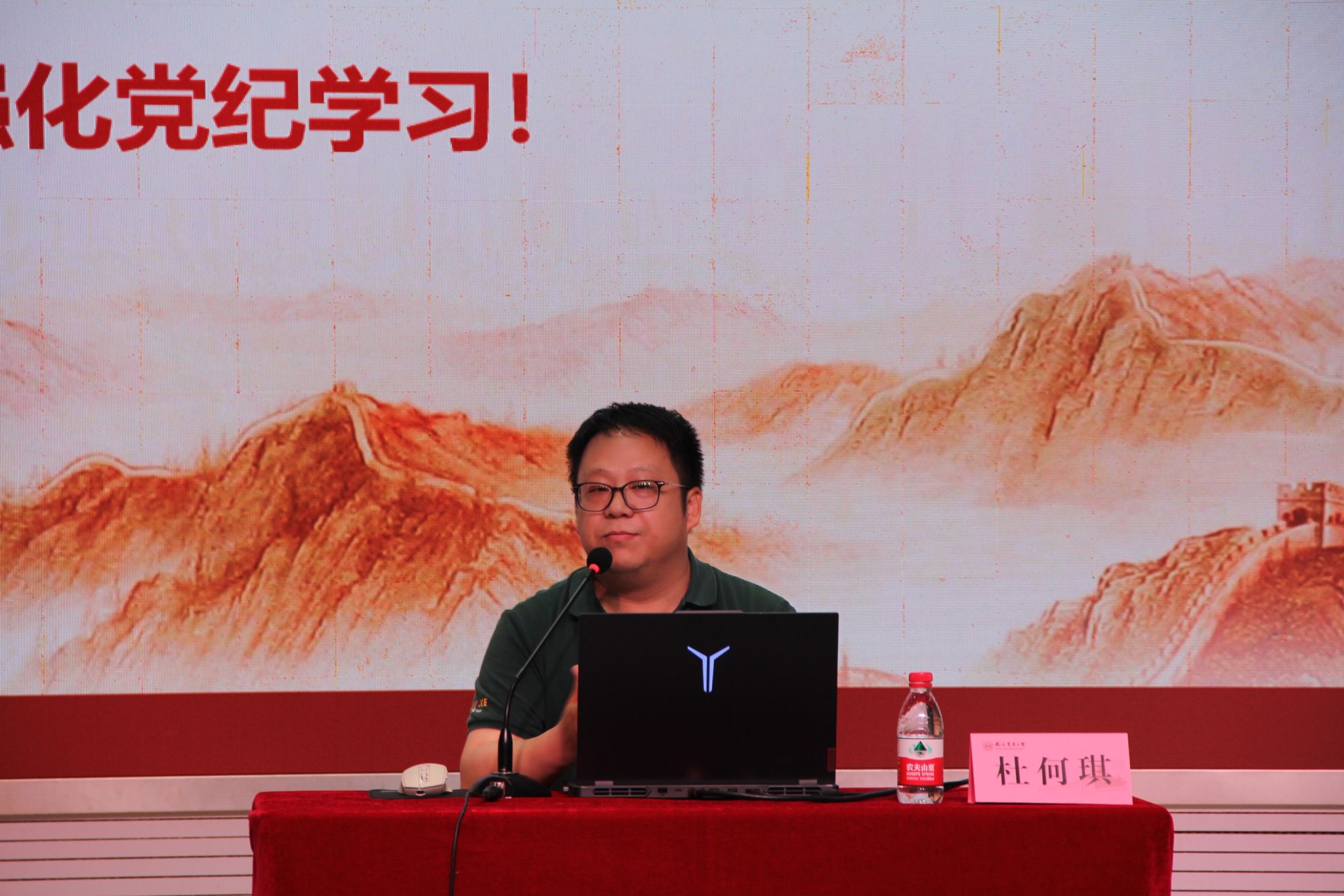 本次党课,杜何琪老师从“这个世界上有多少个政党?”“这个世界上超过一百年的政党的有几个?”“这个世界上超过一百年的、依然(有机会)执政的有几个?”“这个世界上超过百年的、一直执政、永葆活力的政党有几个?”这四个问题引入,带领大家探讨党纪党规对于一个政党的意义。他详细地讲述了《中国共产党纪律处分条例》修订背景及意义、修订的主要条款、修订精神的贯彻落实等三个方面的内容。他表示,中国共产党从第一次全国代表大会的57名党员,历经风雨,在28年后成为了执政党,带领中华民族走向独立与富强,作为一个“百年大党”将继续坚持自我革命精神,永葆青春活力。同时,他希望同学们积极做好党纪学习,对自身高标准、严要求,为全面推进强国建设、民族复兴伟业贡献自己的力量。