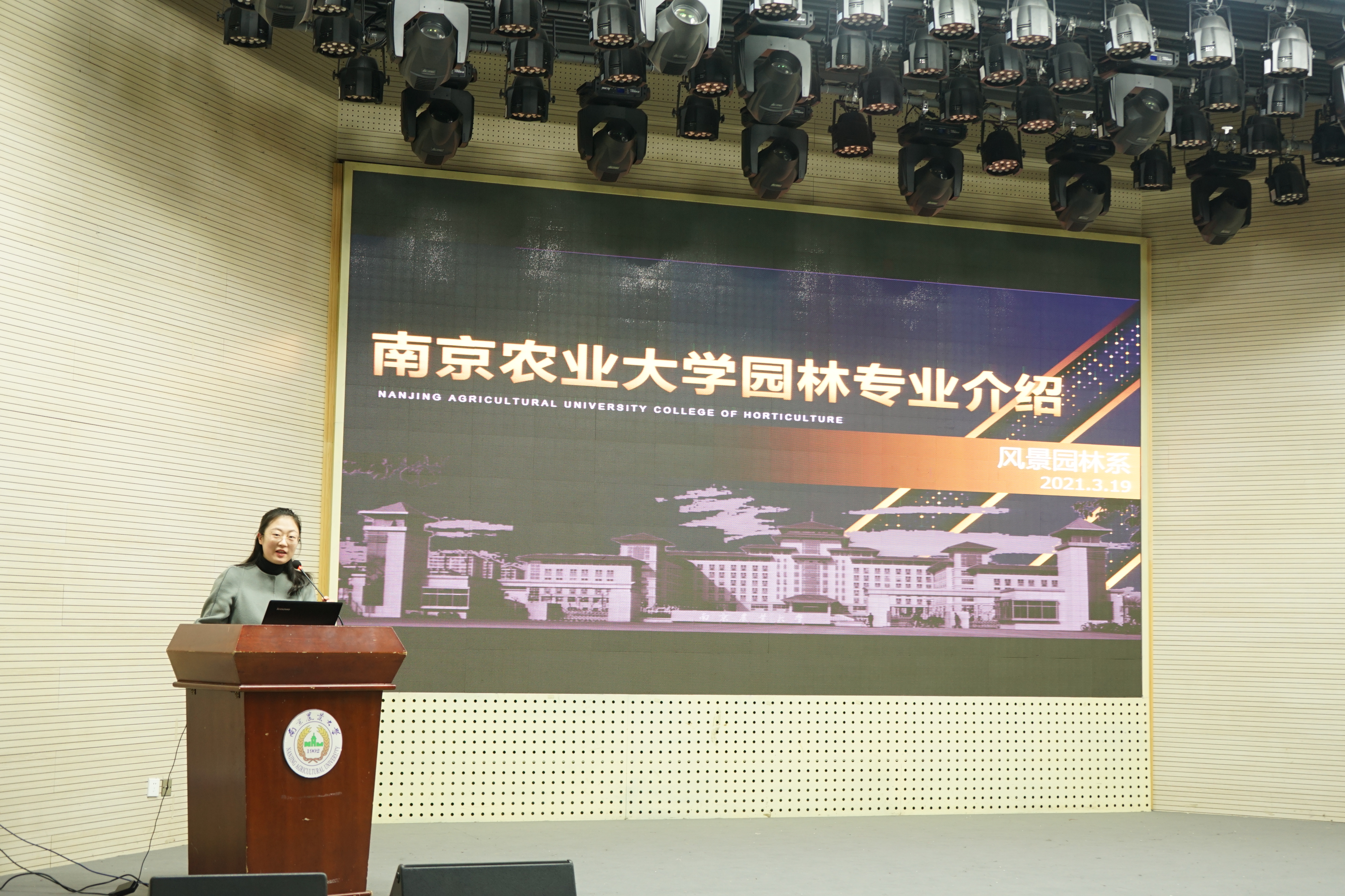 丛昕共分五部分为同学们详细介绍专业。她提出园林专业与其他专业的不同在于其文理交叉的兼容特点和极具学科特色的小班化教学模式。她以风景园林学、生态学、观赏园艺三门课程为主干逻辑介绍课程设置,欢迎有一定美术功底的同学选择。