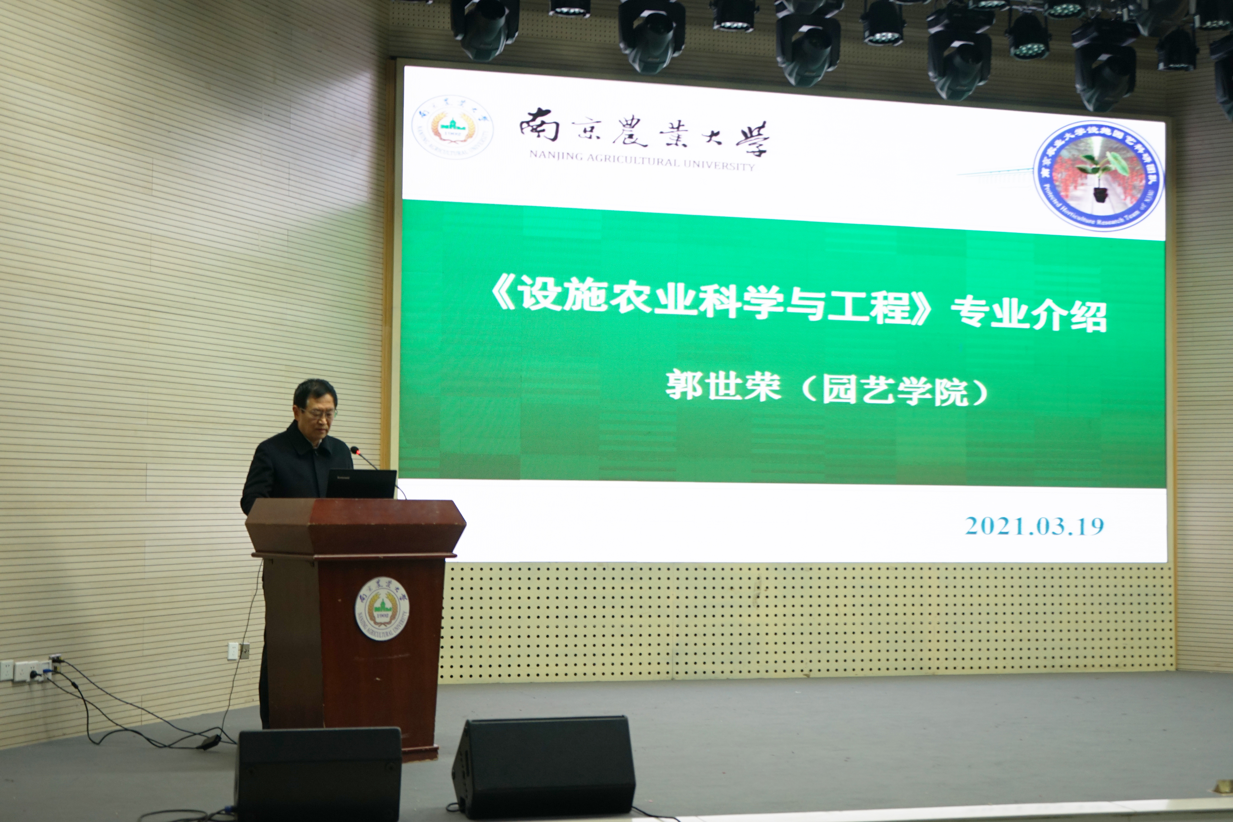 紧接着郭世荣上台,他首先解答了学生们对于设施专业内涵的疑惑:设施农业是借助于人工保护设施来生产农产品的农业生产方式。接着他分别从专业特色、专业重要性、专业实力,毕业生基本情况四个方面进行介绍,强调要培养和增强学生现代农业和高效农业的意识,树立优质、高效、绿色的基本理念。