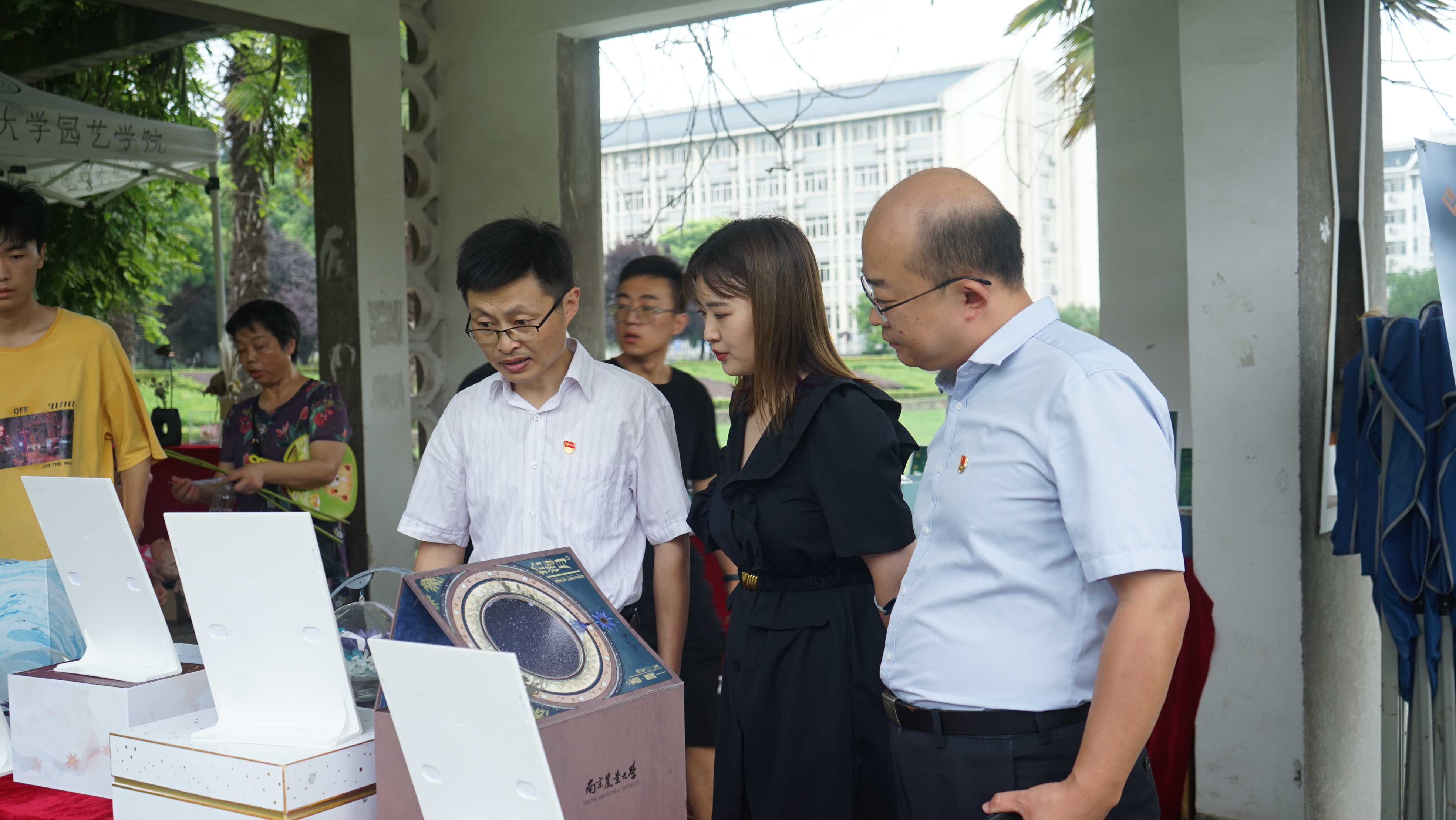 开幕式结束后,荷花与睡莲团队副教授金奇江向到场师生介绍本次荷花展的内容,并带领大家前往展示区。展区中,除了一盆盆绽放的荷花外,由荷花和睡莲等花材搭建的别致小景散落在桃李廊各处,永生花、鲜切花、折花等花艺材料在工作人员的手中变幻着形状与色彩,减肥专属的荷花茶、美味的荷花藕粉以及飘香的荷花酒在产品展区引得众多师生品尝和称赞。