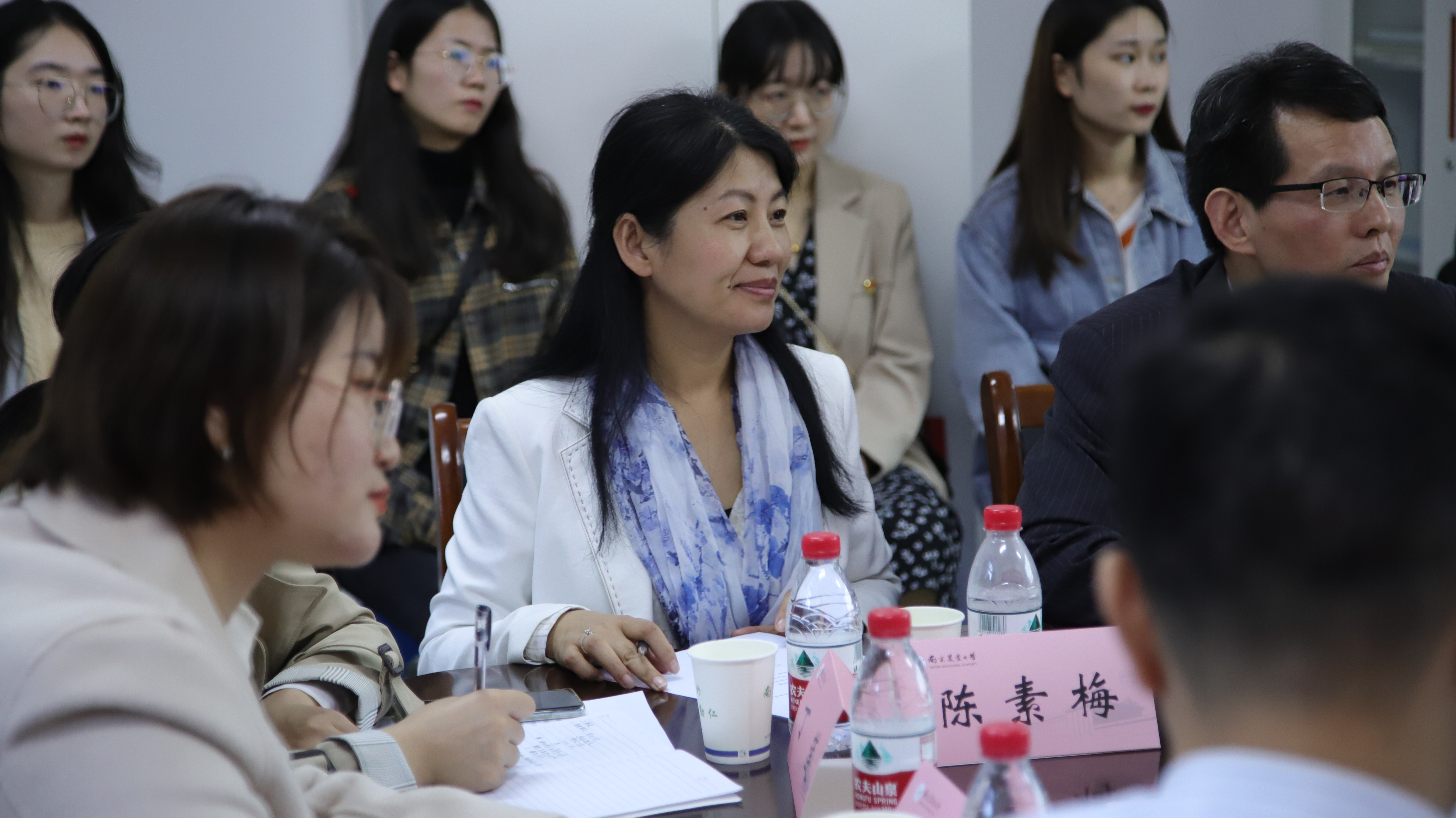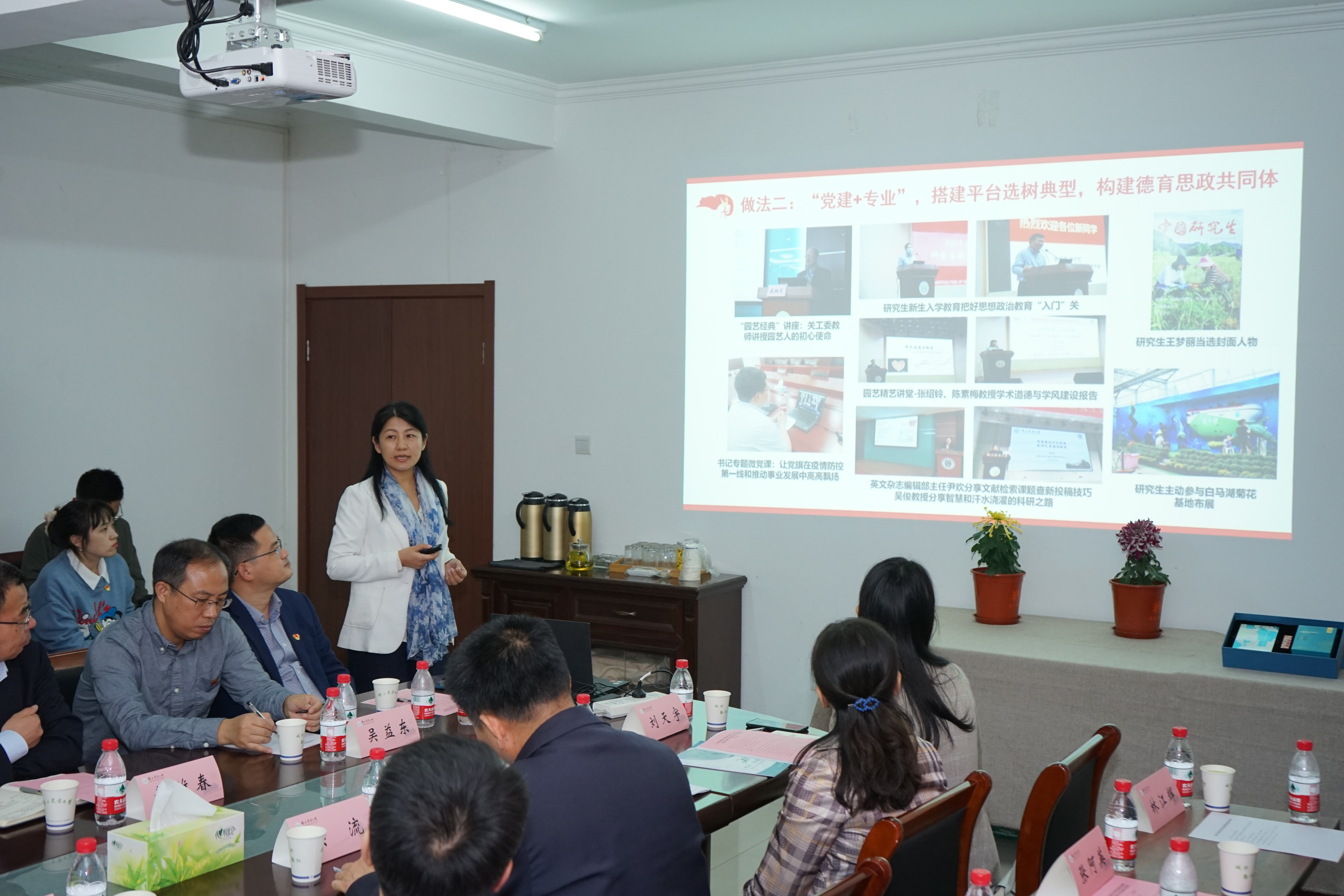 副院长陈素梅介绍学院研究生党建与课程思政建设概况,她从组织建设情况、研究生党建工作模型入手,全面介绍了学院研究生党建与课程思政工作思路、探索路径和相关成效。