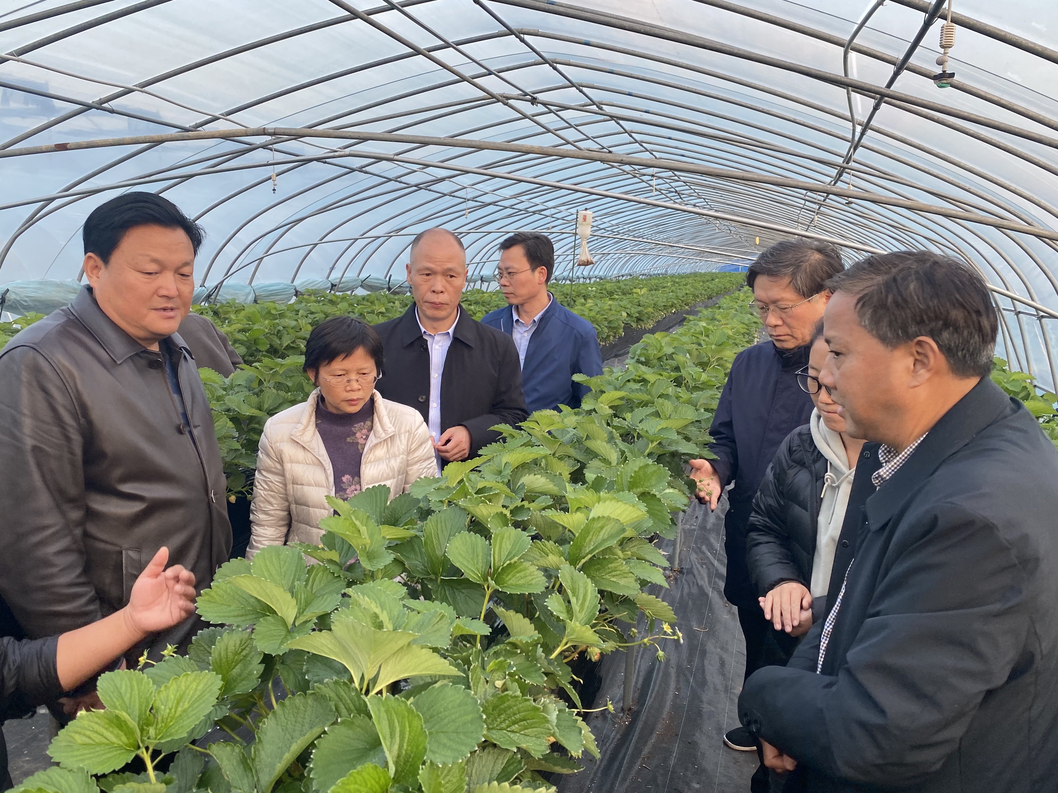 与会专家和项目组成员随后参观了生产基地和项目研发基地,南京金色庄园农产品有限公司总经理吴中平介绍了公司概括、发展愿景和设施草莓生产存在的问题,专家就设施草莓生产的关键核心技术研发进行了现场指导。