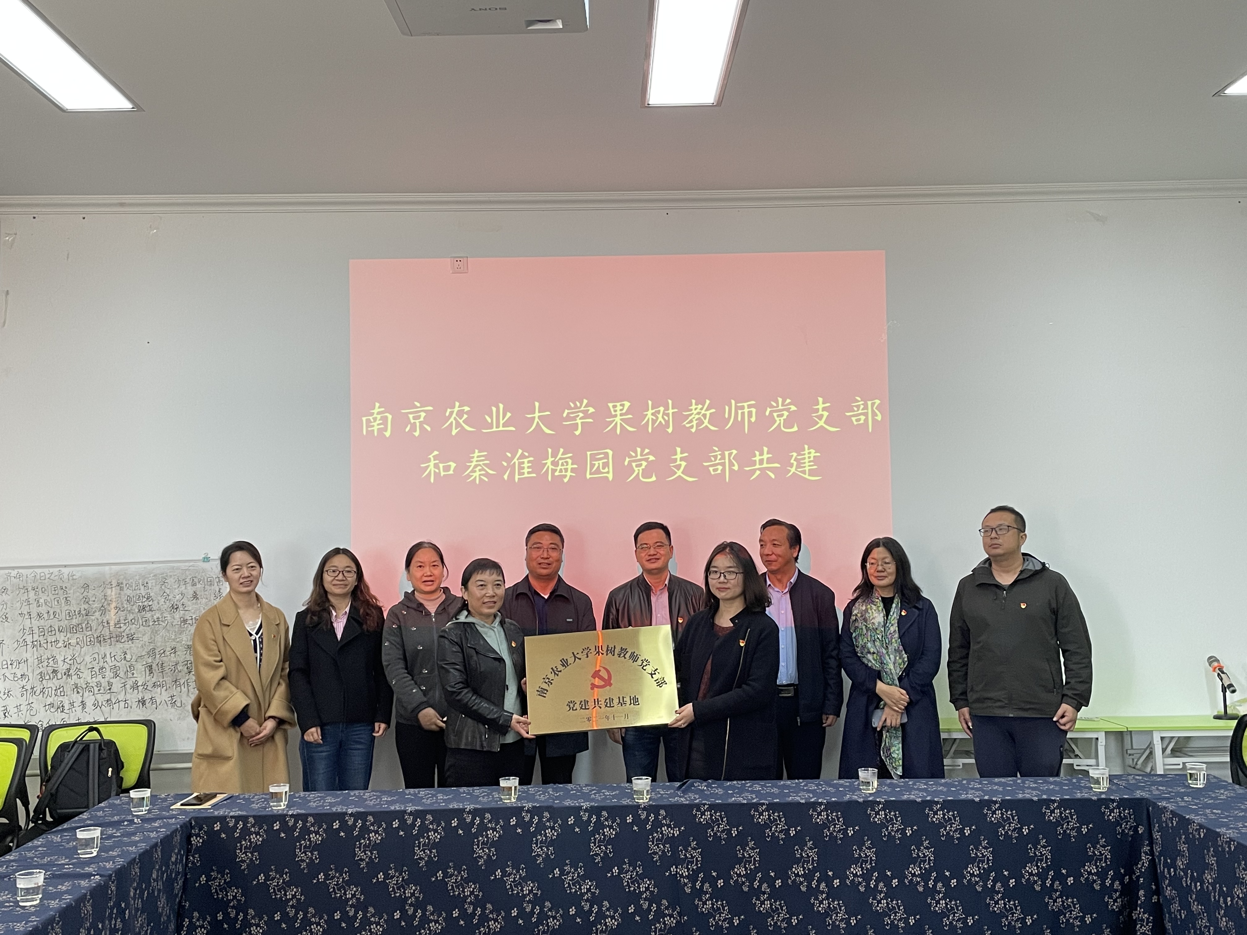 和秦淮梅园公司的情况,探讨交流了共建合作的具体内容。果树教师党支部书记高志红和秦淮梅园党支部书记叶岚岚共同进行了党建基地共建揭牌。