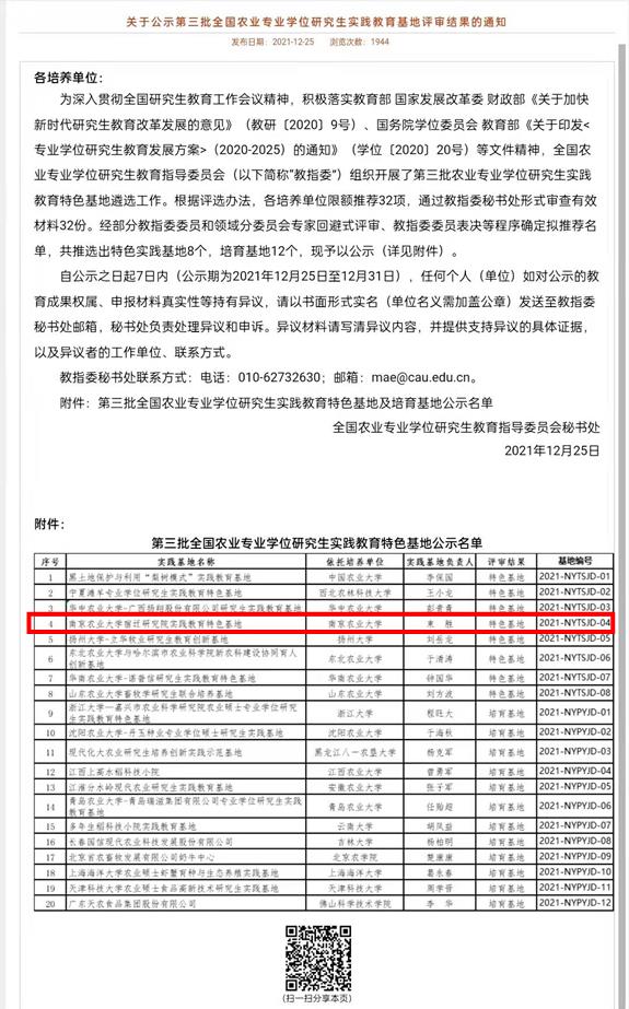 近日,全国农业专业学位研究生教育指导委员会组织开展了第三批农业专业学位研究生实践教育特色基地遴选工作。经教指委委员和领域分委员会专家评审、教指委委员表决等程序,共推选出实践教育特色基地8个,培育基地12个,南农大电子竞技