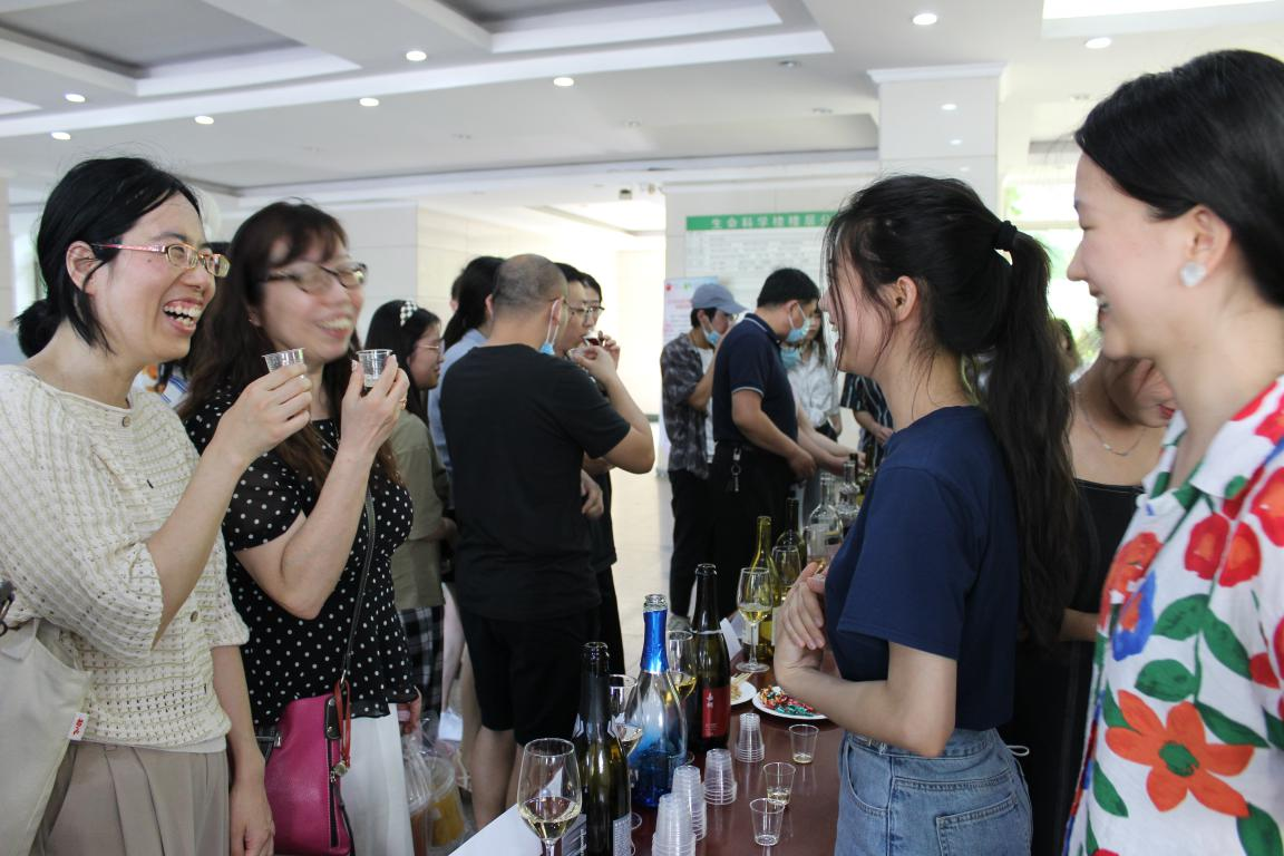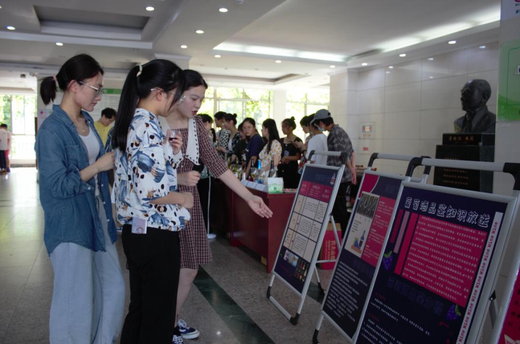 初夏来临,一杯甘甜美酒格外吸引人。葡萄酒品酒文化会上,师生络绎不绝,展现出我校师生对葡萄酒的浓厚兴趣。葡萄酒是葡萄或葡萄汁经过传统及科学方法相结合进行发酵的果酒,天然的葡萄酒中蕴含多种抗氧化物质,营养价值丰富。葡萄酒的品质受原材料、酿造方法、酿造技术等的影响,不同类型区别较大。本次活动提供多种葡萄酒的对比品鉴机会,包括项目自酿红葡萄酒以及起泡葡萄酒、干型白葡萄酒、桃红葡萄酒、甜型红葡萄酒、干型红葡萄酒共计10余不同品牌和酒款,旨在通过品酒会加深大家对葡萄酒相关知识与文化的了解。