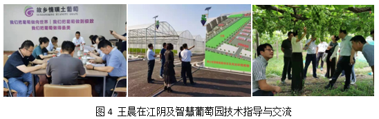 璜土智慧葡萄园项目以促进地方农业产业化公共服务能力,引领带动地方特色产业高效、持续、稳定发展,让璜土葡萄产业得到全面提升,加速全产业链的发展模式,成为农业产业工业化智能化生产示范。自2019年项目启动以来,王晨教授基于数字信息化与物联网系统,结合葡萄生长发育与环境条件耦合智能调控开展项目研究,并从葡萄园环境智能调控、土壤及气象数据采集、水肥一体化智能系统、智能病虫害防控等多个模块长期对企业技术人员开展智慧化生产培训与技术指导(图4),并根据地方与园区工作以及社会服务的需求,经常深入一线交流智慧葡萄园的发展以及技术培训。