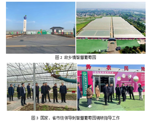 江阴葡萄栽培历史悠久,‘美人指’葡萄曾是2008年奥运会专供水果,其葡萄栽培技术走在全省乃至全国前列。基于对葡萄智能生产与水肥一体化技术推广的需求,2020年,江阴璜土镇向江苏省科技镇长团打报告申请葡萄专家到璜土镇挂职,经学校与学院推荐,王晨同志于2020-2021年度到江阴璜土镇挂职副书记,重点负责农业尤其葡萄产业的发展与规划,并将葡萄精准栽培、智能水肥一体化、智能环境检测与病虫害防控等技术在江阴璜土、顾山、月城、华士、霞客等镇大面积推广。为更好地打造葡萄智慧中心,王晨教授作为技术专家协助江阴市璜土镇申请了中央农业产业强镇项目,总投资4000万元,建设了璜土智慧葡萄园。该园占地100亩,已经成为江苏省葡萄产业现代化智能化的示范与样板(图2)。项目启动以来,国家农业农村部、省农业农村厅、市县各级农业农村局及各级党委政府领导多次到智慧葡萄园调研指导工作(图3)。