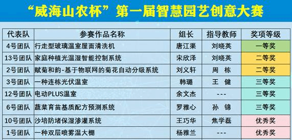 本次大赛共有13个团队参赛,代表队作品各具特色,有温室性能优化设计类、农产品自动分级类、蔬菜育苗基质配方预测类、家庭种植设备或控制系统及智慧平台类,虽然作品有这样或那样的不足,但迈出第一步已是进步的开始,各参赛队作品相比初赛已有了长足的进步,有些创意和设计具有良好的应用价值。经过激烈地角逐,最终产生一等奖1名,二等奖2名,三等奖3名,优秀奖2名,优秀指导教师1名。具体代表队信息如下表所示。