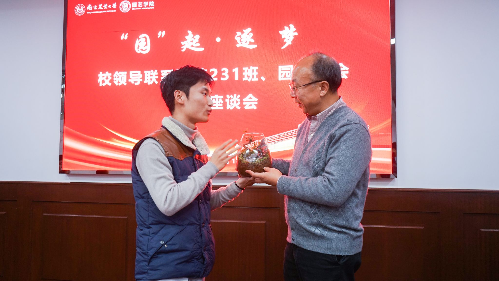 座谈会上,钱春桃及赵爽老师就园艺231班和园艺协会的情况做了简要介绍,相关学生负责人也就特色活动开展情况进行汇报,丁校长充分认可班级、协会的相关建设,并对未来发展给出了意见建议。活动的最后,班级和协会还向丁校长赠送了自己精心制作的礼物。