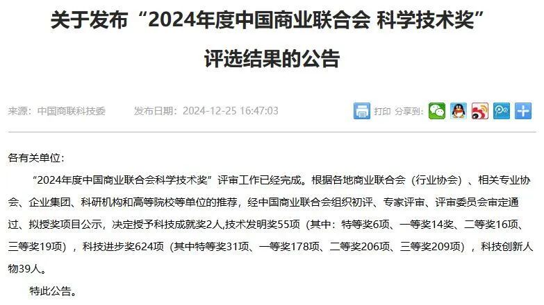 汪良驹团队喜获2024中国商业联合会科技奖 技术发明一等奖