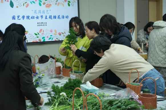 工会于滨江校区园艺楼167举办“花满园艺”——妇女节主题插花活动,院长陈素梅、院党委副书记石木舟及各学科教师参与。