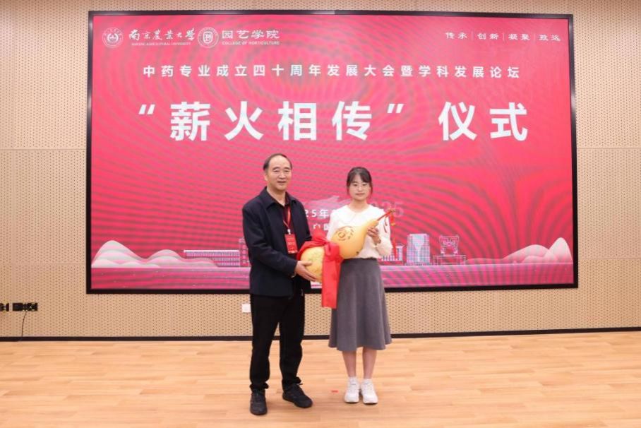 会上,1985级校友、上药控股镇江有限公司总经理冷国宏,1996级校友、江苏省连云港中医药高等职业技术学校副校长胡玉涛,2006级校友、山东福牌制药有限公司销售总监张士鹏,2016级校友、中国中医科学院在读博士生唐思琪作为校友代表分别发言。大会还举行了“薪火相传”仪式,中药学专业创始人之一,国家药典委委员,俄罗斯工程院外籍院士郭巧生教授将象征悬壶济世精神的“宝葫芦”传递给2025级中药专业本科新生朱静轩同学。郭巧生回顾了中药专业四十年的发展历程,指出我校中药学是我国高等农林院校中首个中药专业和首个医学门类中药学一级学科硕士点,为国家中药事业的传承、创新和发展培养了大批人才,产出了丰硕成果。
