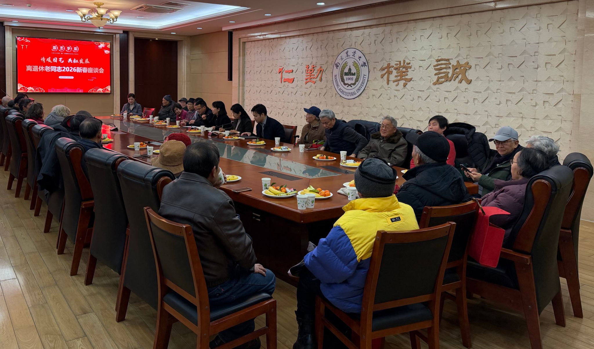 在卫岗校区金陵研究院2楼裕光厅隆重举办2026年离退休教师新春茶话会。学院党委书记吴彦宁、院长陈素梅、院党委副书记束浩渊、副院长王海滨、副院长束胜出席会议,会议由学院党委书记吴彦宁主持。
