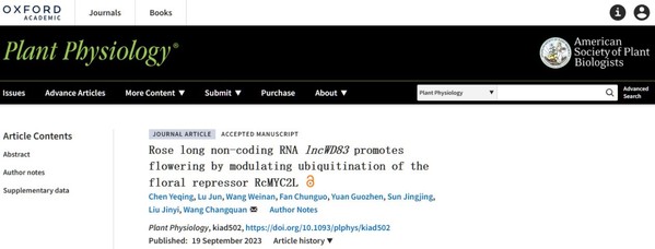 王长泉教授团队在Plant Physiology杂志发表了题为“Rose long non-coding RNA lncWD83 promotes flowering by modulating ubiquitination of the floral repressor RcMYC2L”的研究成果,该研究从月季Rosa chinensis‘Old Blush’中鉴定出lncRNA lncWD83,解析了其促进月季开花的分子机制。