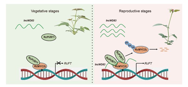 基于上述研究结果,论文提出了lncRNA调控月季开花的工作模型(下图)。营养生长时期lncWD83的表达量较低,RcMYC2L结合到RcFT的启动子,抑制RcFT表达及开花。生殖生长时期lncWD83的表达量显著升高,结合E3泛素连接酶RcPUB11,助力其对RcMYC2L的泛素化降解,移除RcMYC2L对RcFT的转录抑制,从而促进开花。该研究结果不但揭示月季开花调控的新机制,而且提供了lncRNA调控植物开花的新模式。
