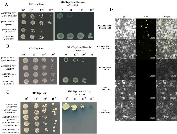 (2)筛选到了BcZAT12的互作蛋白BcABF2和BcABF4(图4),上游基因BcNTL4/BcNAC055(图5)以及下游基因BcCBF1(图6)。
