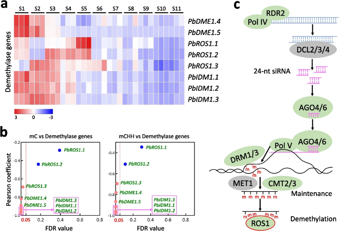 图2.梨果肉发育过程中DNA甲基化水平的提升由去甲基化酶基因ROS1表达量下降引起