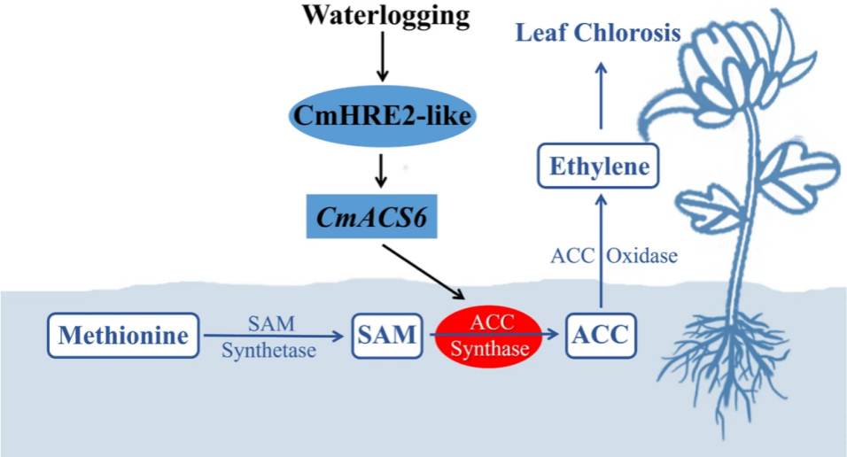 耐涝性|菊花遗传与种质创新团队揭示CmHRE2L-CmACS6转录级联负调控菊花涝渍胁迫的分子机制