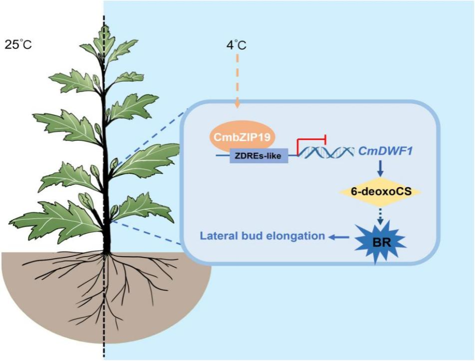 分枝是植物发育的重要性状,直接影响了菊花的种植模式、生产成本和观赏性。团队先前的研究表明,油菜素内酯BR在菊花中的分枝调节中起重要作用,但具体调控机制尚不清晰。该研究鉴定到一个调控BR积累影响侧枝伸长的bZIP家族转录因子CmbZIP19。RNA-seq和DAP-seq联合分析发现,CmbZIP19直接结合在BR合成关键基因CmDWF1的启动子区域并抑制其表达,导致BR合成减少,侧枝发育减缓。CmbZIP19的表达被低温诱导,参与了低温抑制菊花侧枝伸长的过程。该研究揭示了CmbZIP19通过BR途径参与低温对菊花株型的调控,为优异株型菊花新品种分子育种提供了优异靶基因。
