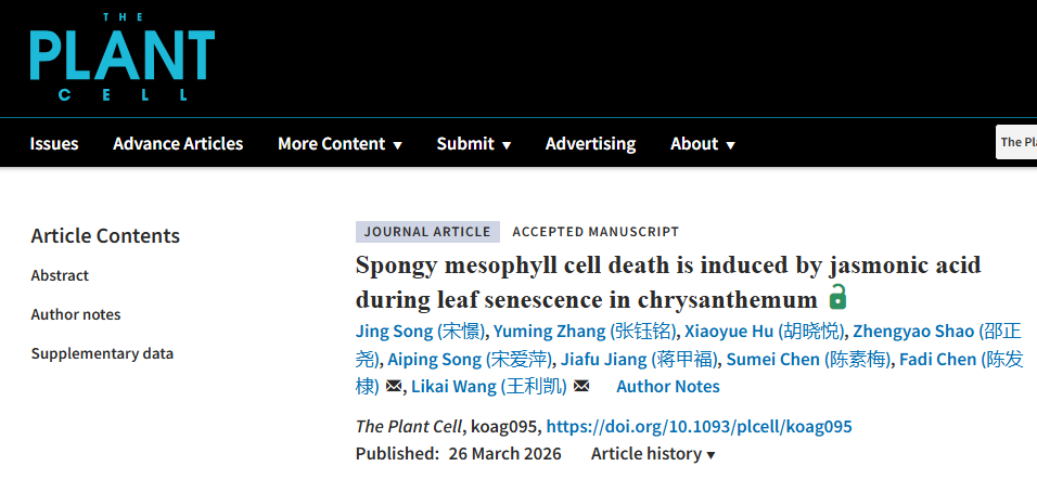 3月26日,电子竞技 菊花遗传育种与种质创新团队在《The Plant Cell》期刊在线发表了题为“Spongy mesophyll cell death is induced by jasmonic acid during leaf senescence in chrysanthemum”的研究论文,揭示了叶片衰老过程中不同细胞死亡时序,发现海绵组织细胞特异NAC055-NAC087-ACX5转录级联模块调控内源茉莉酸(JA)合成进而诱导细胞死亡和叶片衰老的机制,助力精准保鲜技术创新;且发现这一机制在双子叶模式植物(拟南芥、番茄)和单子叶模式植物(水稻)中高度保守,丰富了植物叶片衰老调控网络。