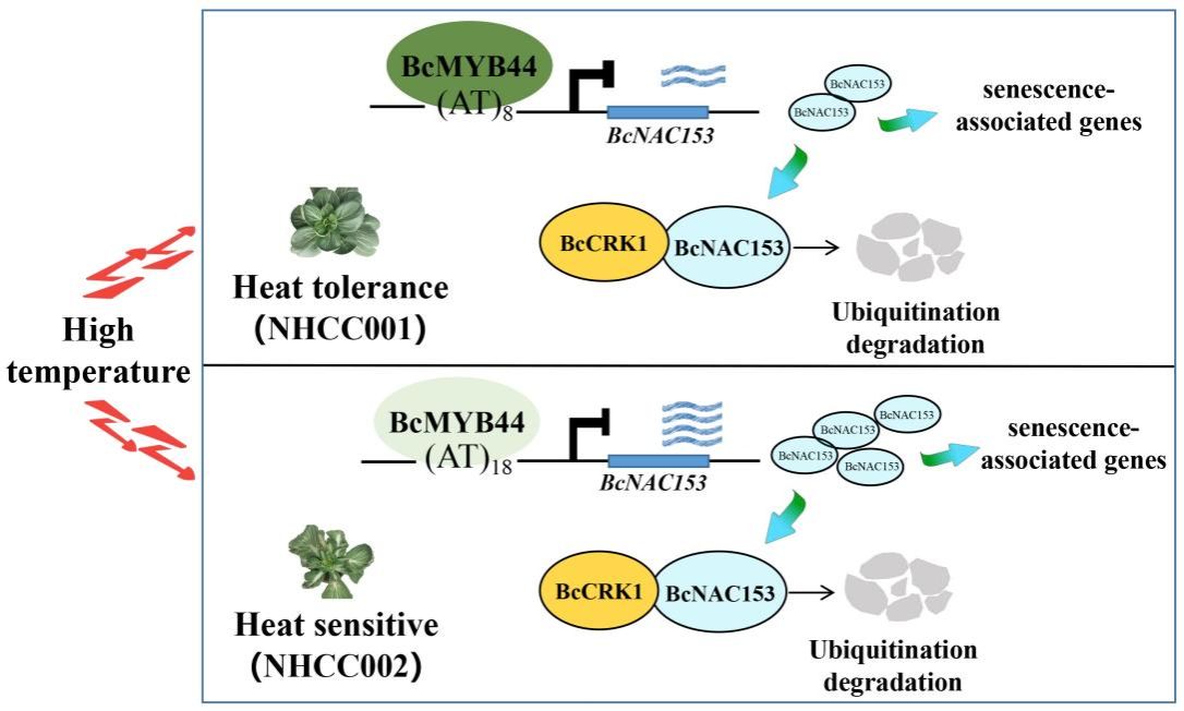 通过在拟南芥和不结球白菜中进行过表达及瞬时转化实验,研究者证实BcNAC153的过表达导致植株高温耐受性显著下降,电解质渗漏率升高,表明BcNAC153是高温耐受性的负调控因子。进一步对BcNAC153启动子序列进行分析,发现耐热与敏感材料之间存在(AT)n插入变异,其中耐热材料中(AT)n插入数量较少(6-8个),而敏感材料中则较多(18-26个)。启动子活性分析表明,该(AT)n插入序列是高温响应所必需的关键顺式元件。通过酵母单杂交文库筛选及双荧光素酶报告实验,研究鉴定出转录因子BcMYB44可直接结合BcNAC153启动子并抑制其转录活性,且BcMYB44在耐热材料中的表达水平显著高于敏感材料,与BcNAC153的表达呈现相反趋势。