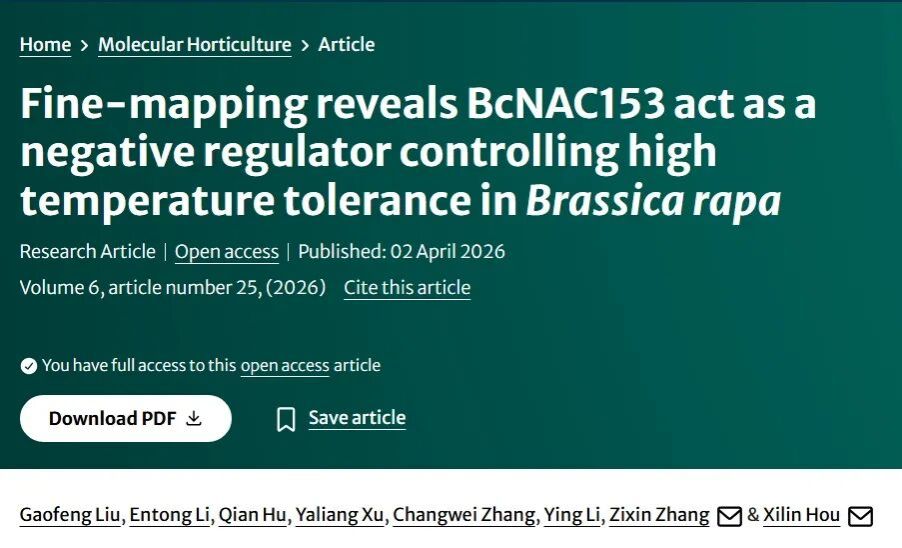 近日,《Molecular Horticulture》在线发表了电子竞技 侯喜林教授团队题为“Fine-mapping revealsBcNAC153act as a negative regulator controlling high temperature tolerance inBrassica rapa”的研究论文。该研究通过构建高密度遗传图谱,成功鉴定到一个调控不结球白菜高温耐受性的关键负调控因子BcNAC153,并系统解析了其在高温胁迫响应中的作用机制,为耐热蔬菜品种的分子育种提供了新靶点。